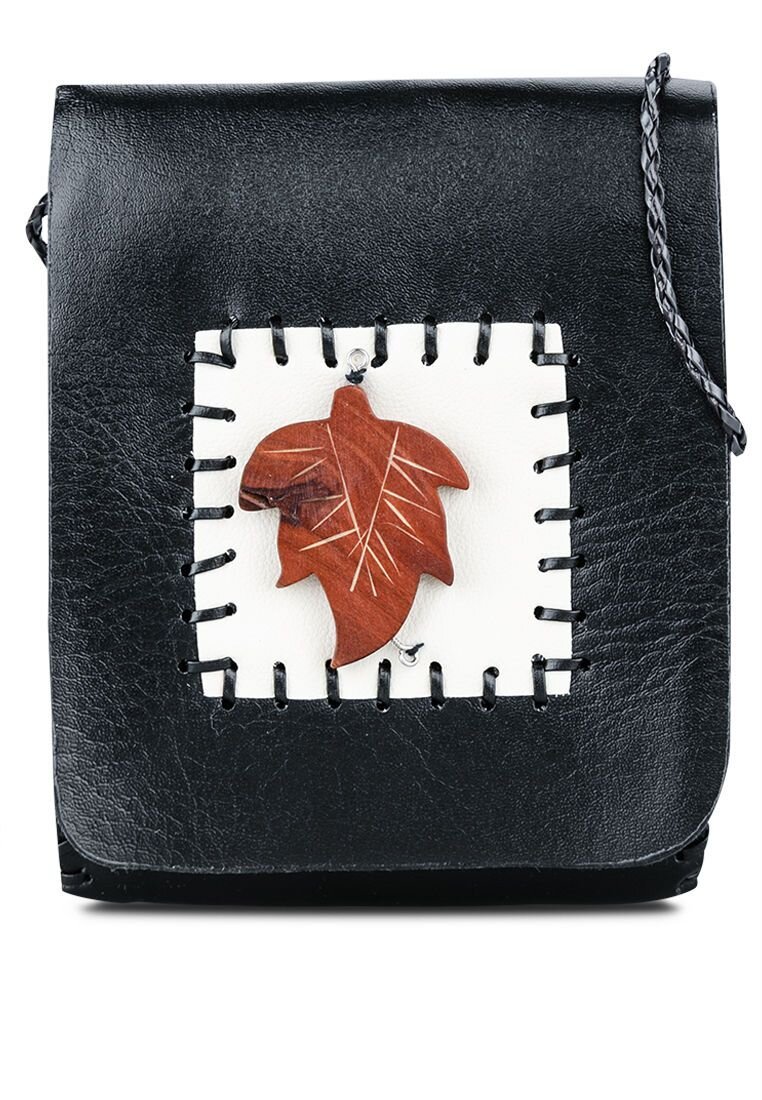 Túi đeo chéo phối màu đen-kem-nâu đỏ của thương hiệu Madam Dzi có thiết kế viền chỉ nổi và đính hình chiếc lá duyên dáng ở mặt trước túi, mang đến vẻ ngoài trẻ